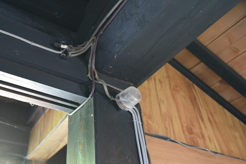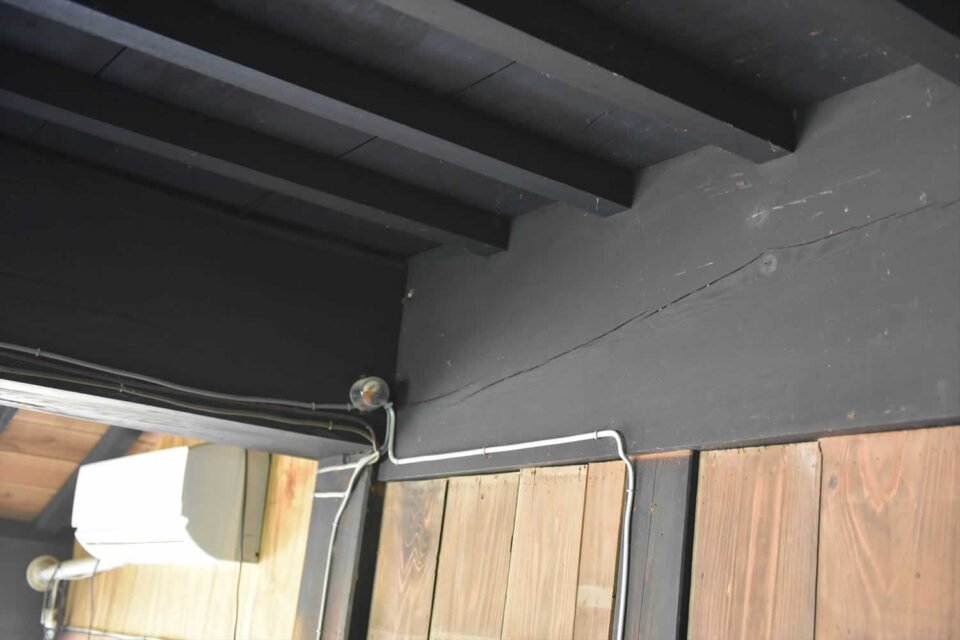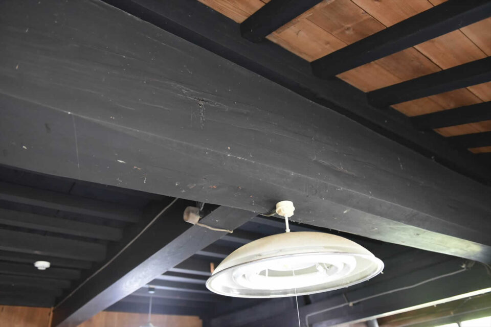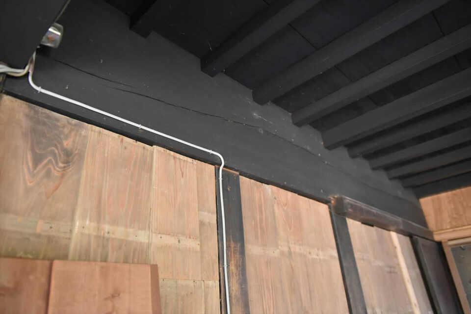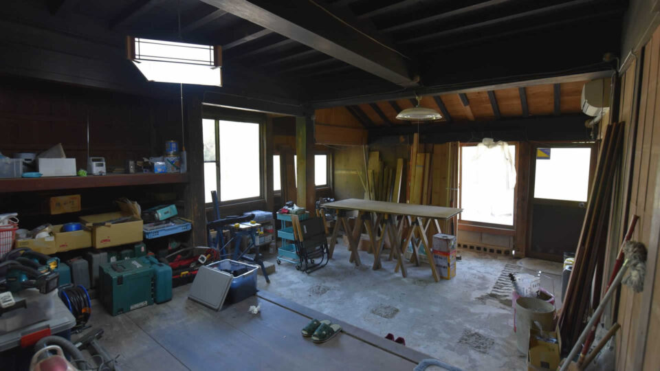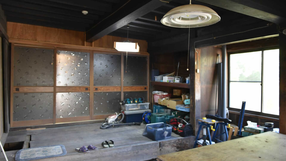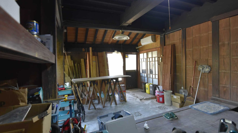 「台所・炊事場」として、かまどや洗い場などの水回りが配置されていました。排水口は後部に設けられ、勝手口と古い井戸が今も残っている。※現在は建築工具などの物置として利用している。