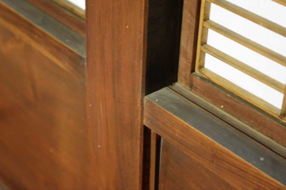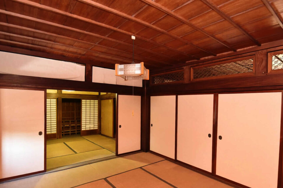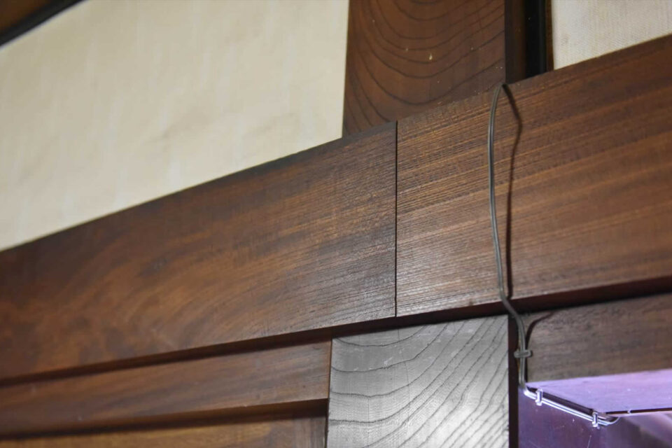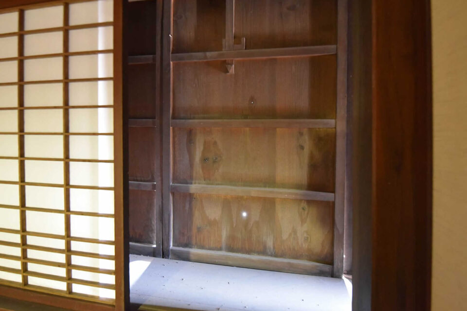 床は畳敷、腰板は欅の一枚板、天井は竿ぶちに秋田杉と内部の造作は簡素ながらとても丁寧に造られている。建具は全て欅材で造られ、豪快な欅普請がこの部屋にも表れている。